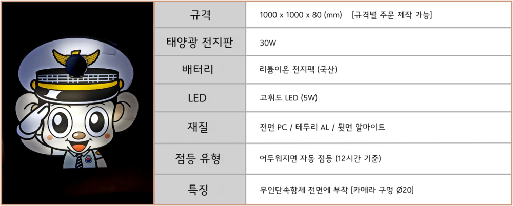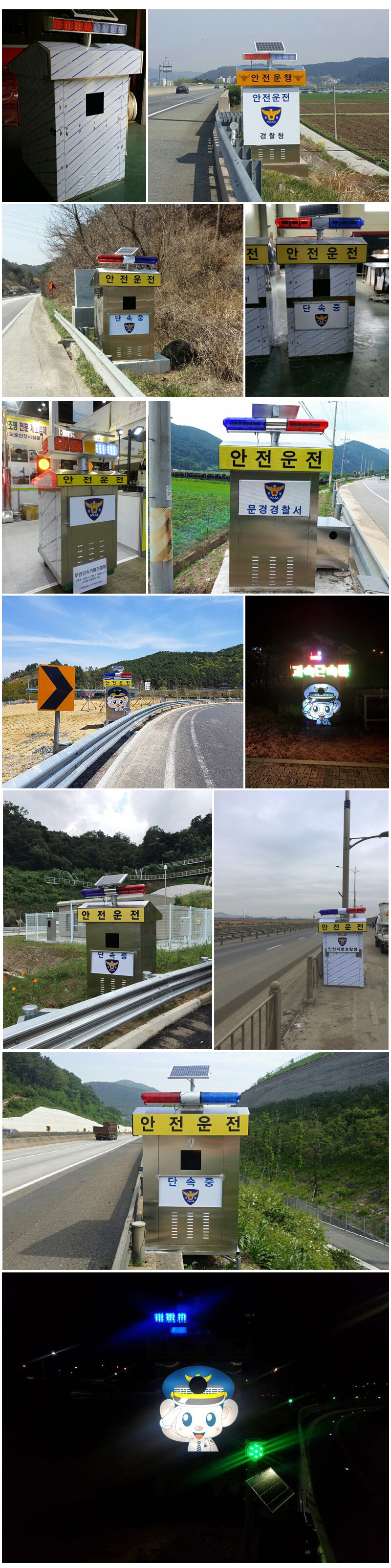 * 본 제품은 이동식 무인 과속 단속 카메라 함체 외부 전면에 간단히 부착하는 제품으로 경찰청을 상징하는 마스코트인 포돌이를 태양광을 이용한