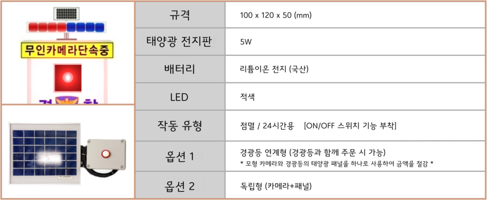 * 본 제품은 이동식 무인 과속 단속 카메라 함체 내부에 설치되는 제품으로 실제 카메라가 아닌 트릭용 카메라로 24시간동안 지속적인 점멸로 감시