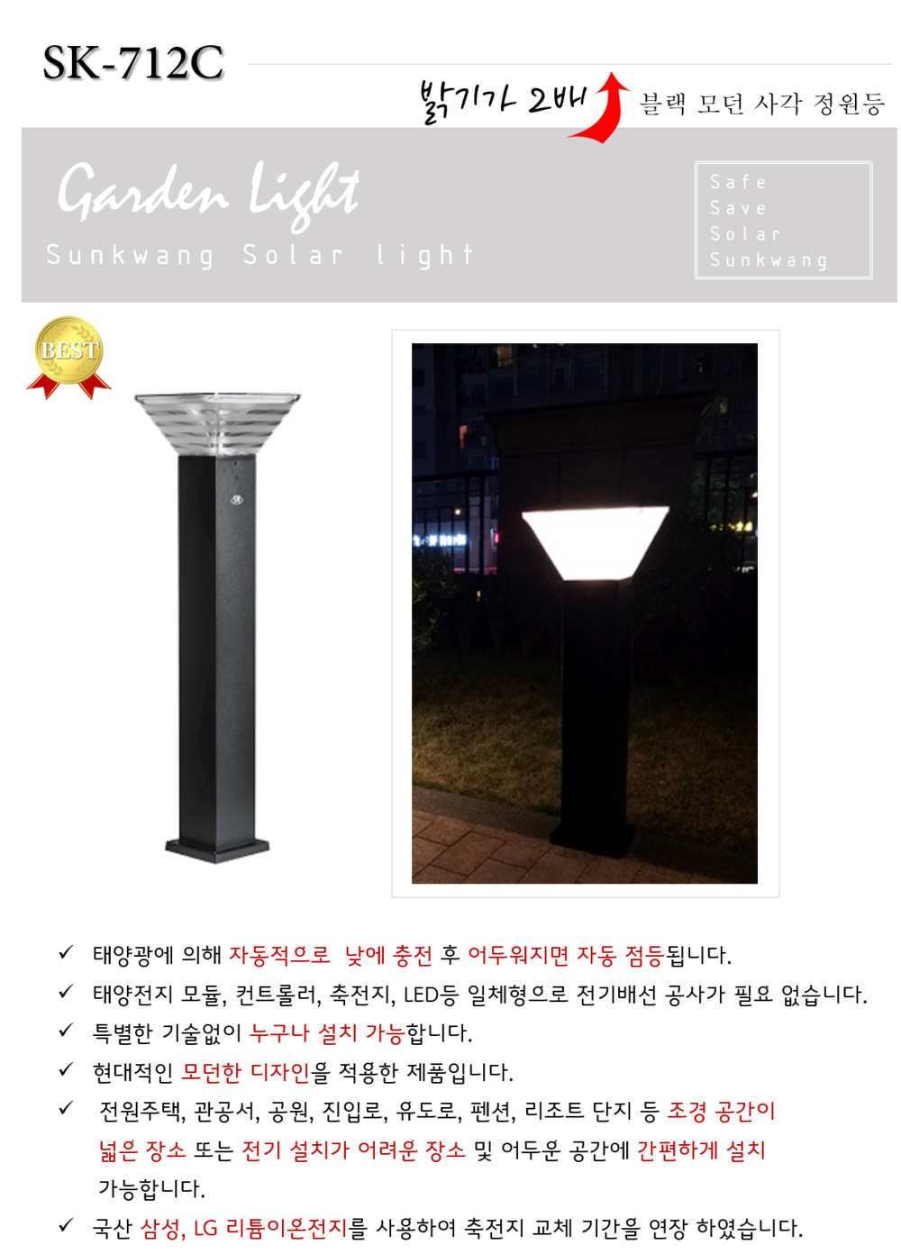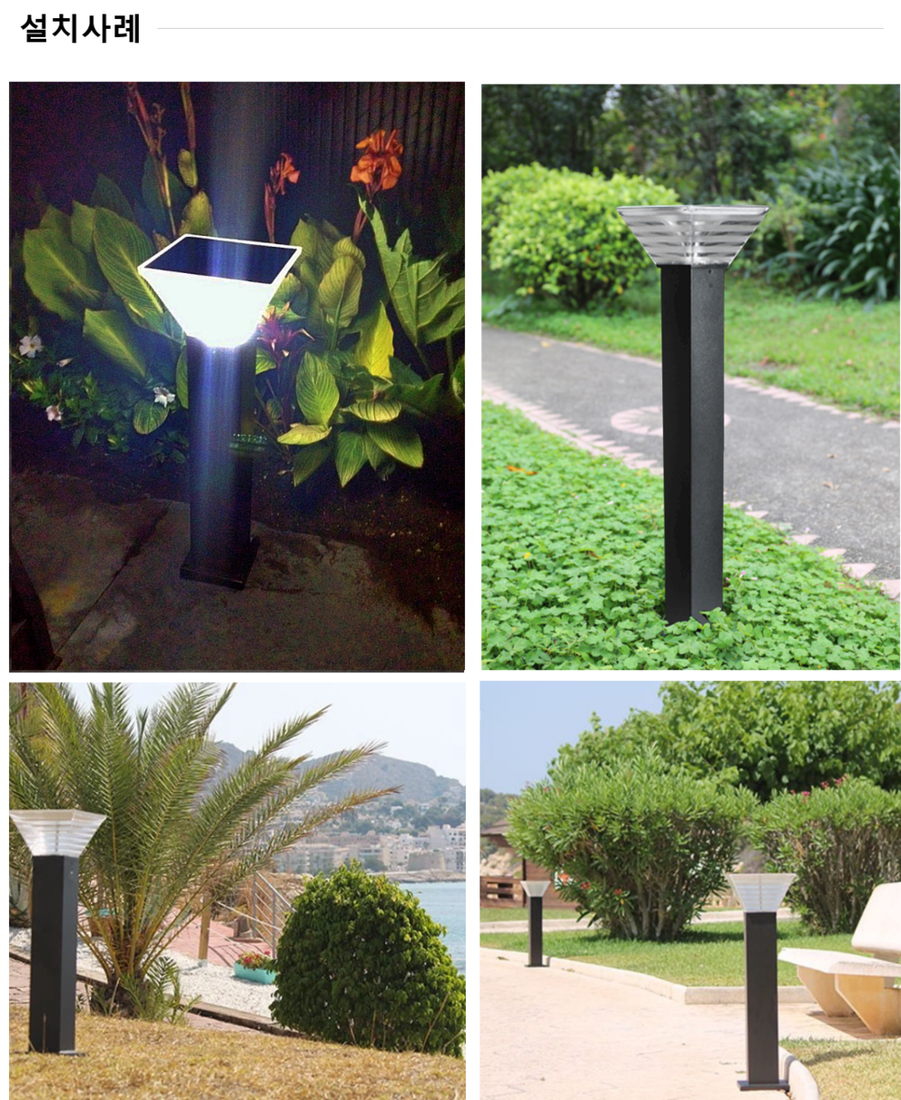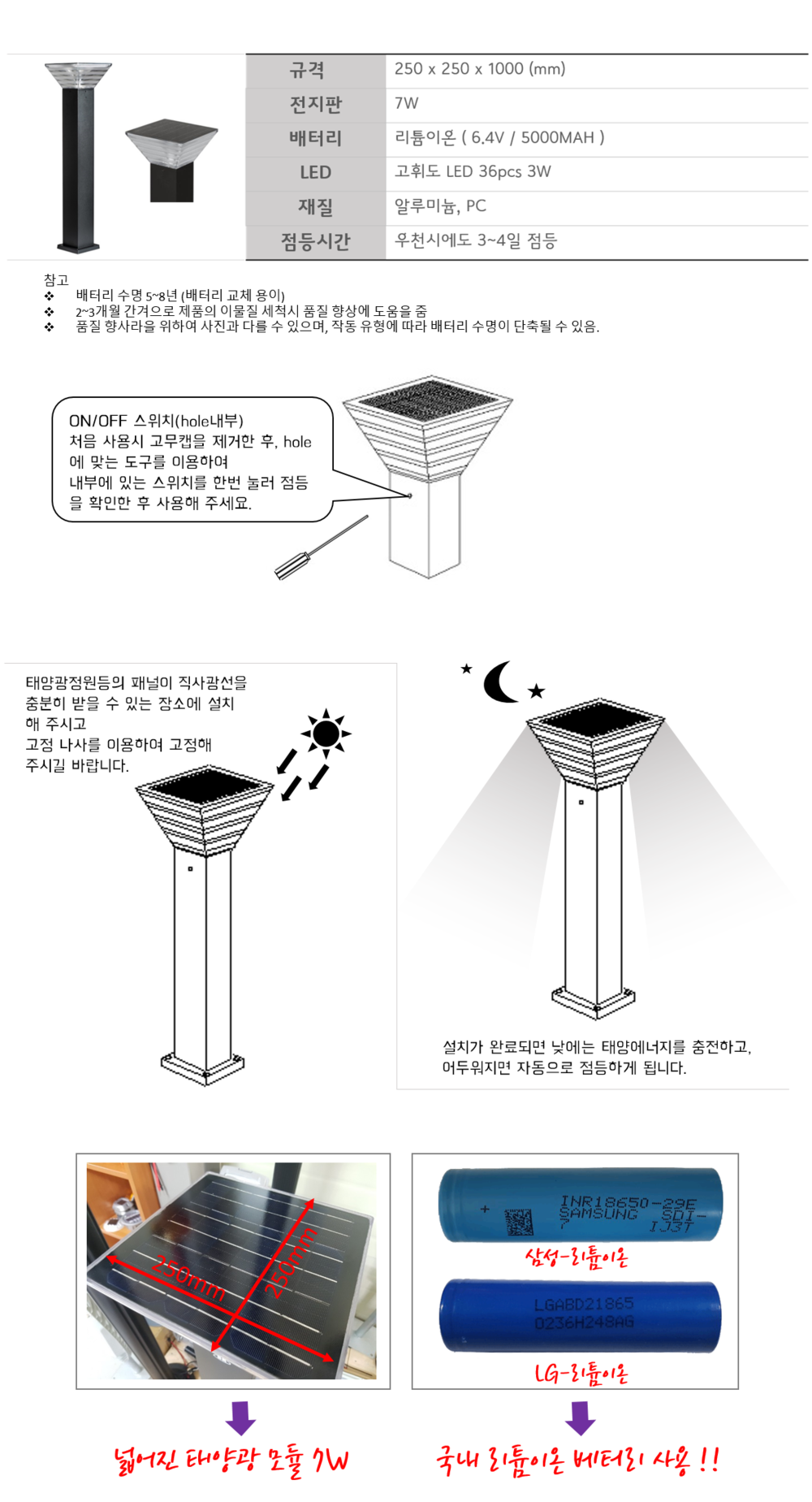 # 태양광에 의해 자동적으로 낮에 충전 후 어두워지면 자동 점등됩니다. # 태양전지 모듈, 컨트롤러, 축전지, LED등 일체형으로 전기배선 공사가 필요 없습니다. # 특별한 기술없이 누구나 설치 가능합니다. # 현대적인 모던한 디자인을 적용한 제품입니다. # 전원주택, 관공서, 공원, 진입로, 유도로, 펜션, 리조트 단지 등 조경 공간이 # 넓은 장소 또는 전기 설치가 어려운 장소 및 어두운 공간에 간편하게 설치 가능합니다. # 국산 삼성, LG 리튬이온전지를 사용하여 축전지 교체 기간을 연장 하였습니다.